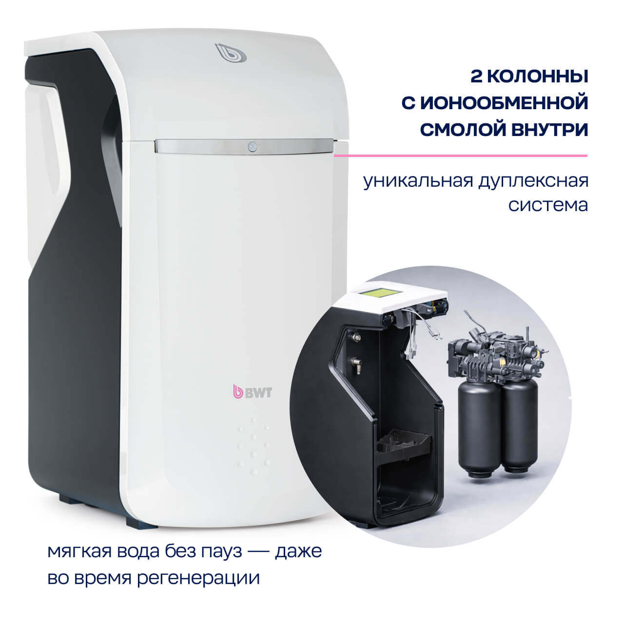 Уникальность умягчителя BWT Perla заключается в наличии двух колонн с ионообменной смолой и адаптивно-параллельным принципом работы по системе «дуплекс». Пока одна колонна внутри кабинетного умягчителя обслуживается, вторая продолжает выдавать мягкую жемчужную воду.
