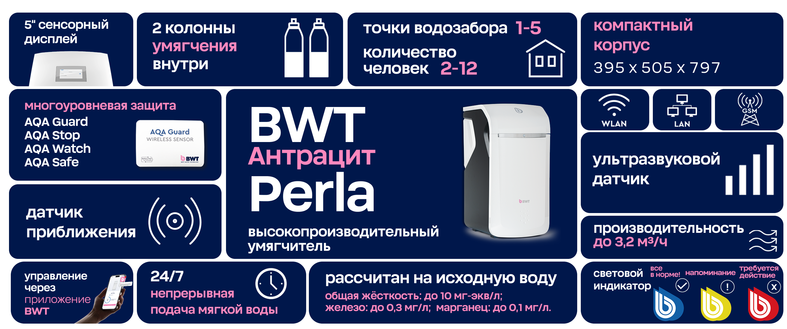 Система BWT Perla разработана для умягчения жёсткой известковой воды и для того, чтобы в вашем доме появилась вода совершенно другого класса. Умягчитель подходит для бытового применения, когда важны стабильность качества воды, комфорт на пиковых нагрузках и управление без лишних движений.