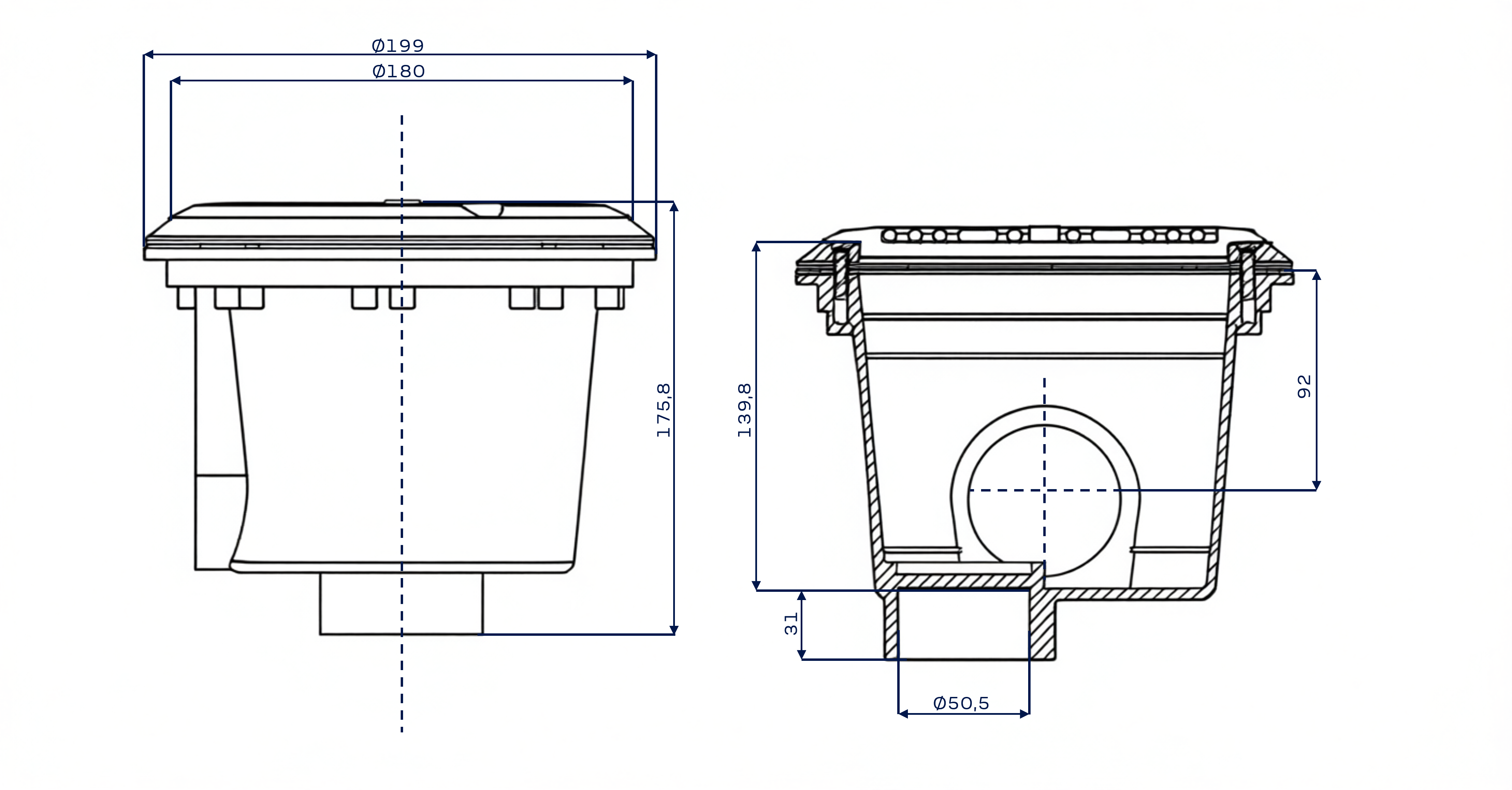 Боковой выход: внутренняя резьба 2" Нижний выход: 50 мм под клеевое соединение |