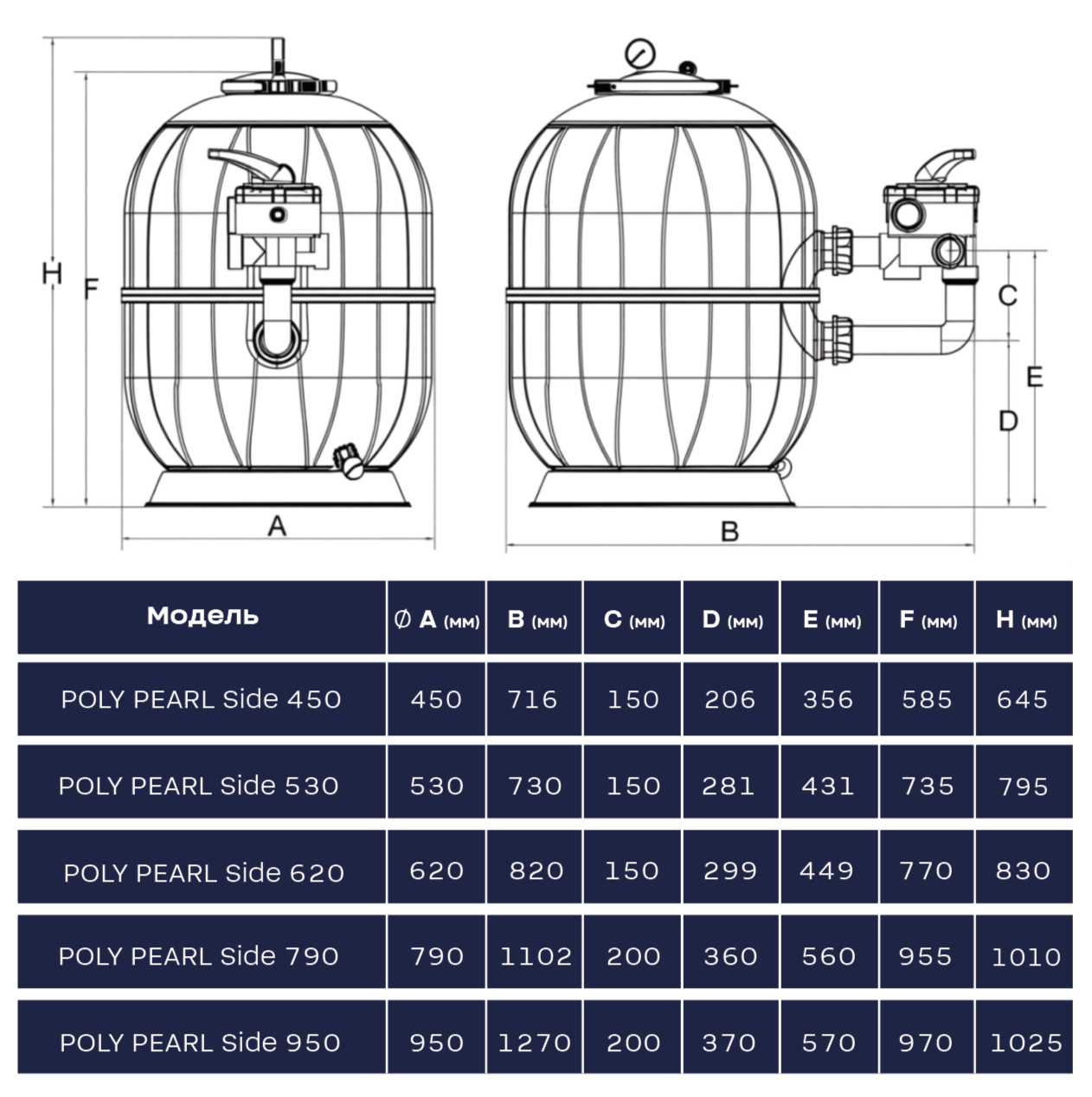 Песочные фильтры Poly Pearl Side: европейское качество с боковым подключением шестипозиционного клапана и антибактериальной внутренней поверхностью.
